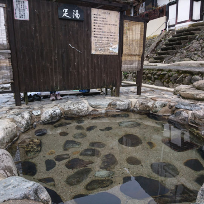 三徳川のせせらぎを間近に感じながら入浴できる、開放感抜群の露天風呂です。しかし、その開放感は想像以上。目の前を行き交う観光客や橋の上からも見えるため、初めて見る人は誰もが驚くことでしょう。