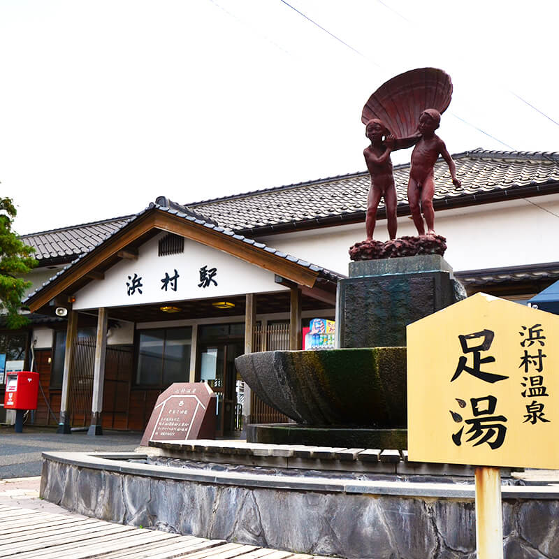 「JR浜村駅」を出てすぐの場所には足湯もあり、到着してすぐに気軽に温泉気分を楽しめます。
