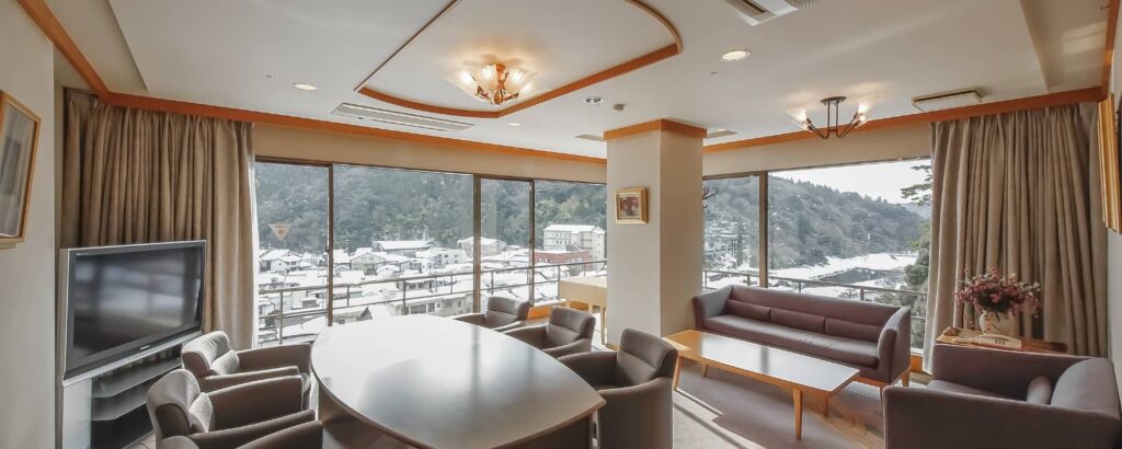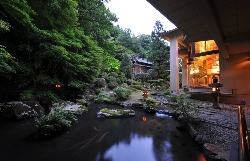 古き良き日本の宿の格調高い雰囲気が漂っており、窓からは三朝川や手入れの行き届いた日本庭園を眺めることができます。