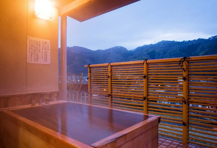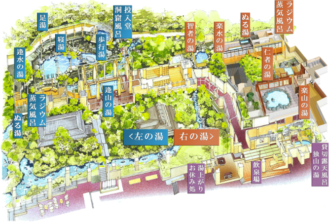 依山楼岩崎の一番の自慢は、「山の湯」と呼ばれる大浴場です。 三朝温泉特有の高濃度ラドン含有量を誇るお湯を、趣の異なる12もの浴槽で楽しめます。