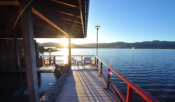 湖に浮かぶように造られた名物の湖上露天風呂では、朝はきらめく水面、夕方はやわらかな夕焼け、夜は静かな湖畔の空気を感じながら、心ほどけるひとときを過ごせます。