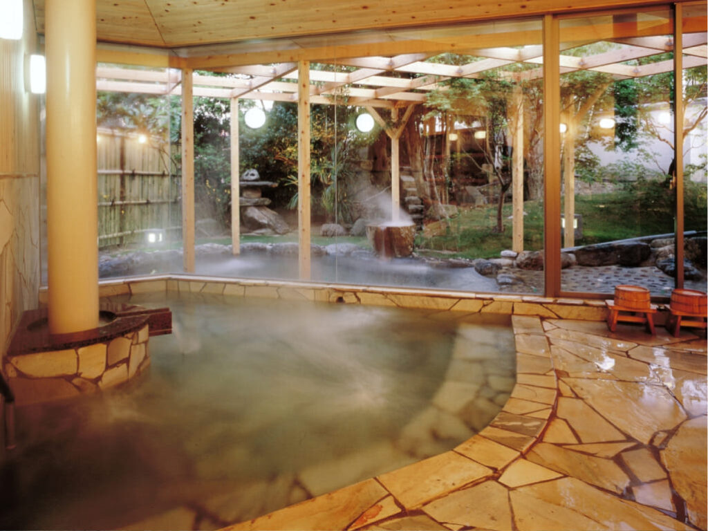 石造りと檜造りの内湯、そして四季の自然を楽しめる露天風呂で、訪れるたびに異なる癒しの時間を堪能できます。
